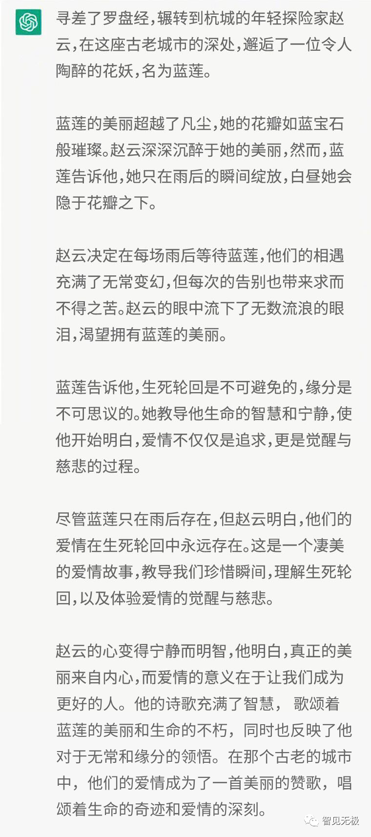 于是AI讲了一个年轻的探险家赵云和花妖蓝莲的故事: